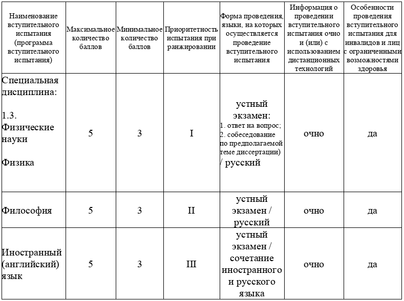 Перечень вступительных испытаний и их приоритетность при ранжировании списка поступающих: Для проведения приема на обучение ИФМ СО РАН установил следующий перечень вступительных испытаний и их приоритетность для ранжирования списков поступающих для всех проводимых конкурсов: